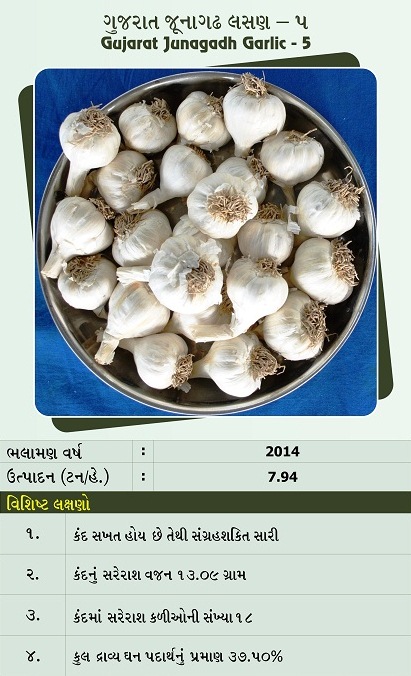 જી-ર૮ર (યમુના સફેદ - ૩) , ગુજરાત લસણ - ર , ગુજરાત લસણ - ૩ , ગુજરાત લસણ - ૪, ગુજરાત જુનાગઢ લસણ - ૫ અને ગુજરાત આણંદ લસણ-૬