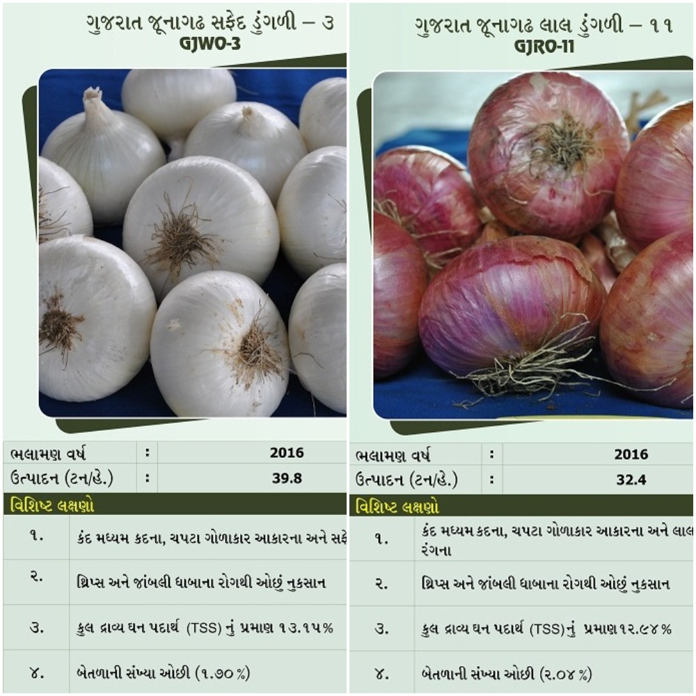 એગ્રી ફાઉન્ડ લાઈટ રેડ, ભીમા શકિત, પીળીપતી (સ્થાનિક જાત), તળાજા લાલ (સ્થાનિક જાત), ગુજરાત જૂનાગઢ લાલ ડુંગળી-૧૧ |
