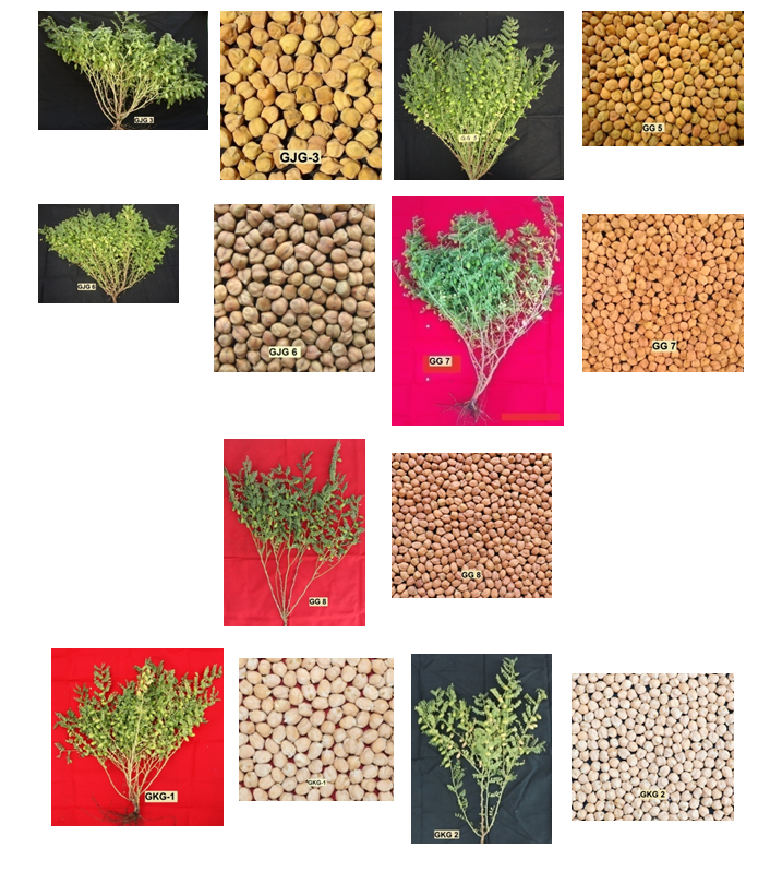 દેશી ચણાની જાતો: ગુજરાત જૂનાગઢ ચણા – ૩, ગુજરાત ચણા – પ, ગુજરાત જૂનાગઢ ચણા – ૬, ગુજરાત ચણા – ૭ અને ગુજરાત ચણા – ૮