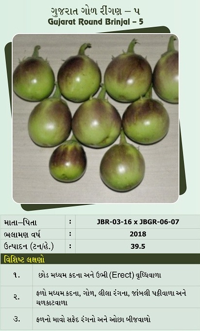 ગુજ. લીલા ગોળ રીંગણ-૧, ગુજ. નવસારીગોળ રીંગણ-૧, ગુજ. જુનાગઢ રીંગણ-૩ અને ગુજ. ગોળ રીંગણ-૫ |