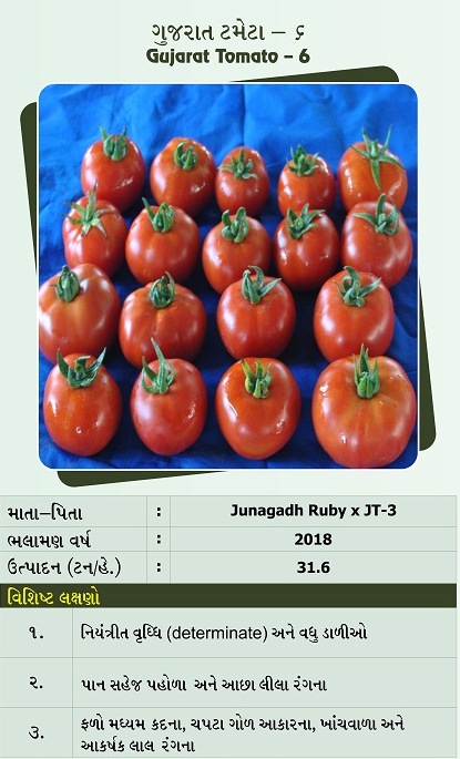 જૂનાગઢ ટમેટા-૩, ગુજરાત ટમેટા-ર, ગુજરાત આણંદ ટમેટા -૩, ગુજરાત આણંદ ટમેટા -૪, ગુજરાત ટમેટા-૬ અને ગુજરાત ટમેટા-૭ |