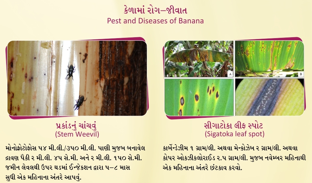 7, કેળના છોડ પર સ્ટ્રેપ્ટોસાઈકિલન ૧ ગ્રામ કોપર ઓકિસકલોરાઈડ ૧૦ ગ્રામ / ર૦ લિટર પાણીમાં ભેળવી છંટકાવ કરવો.